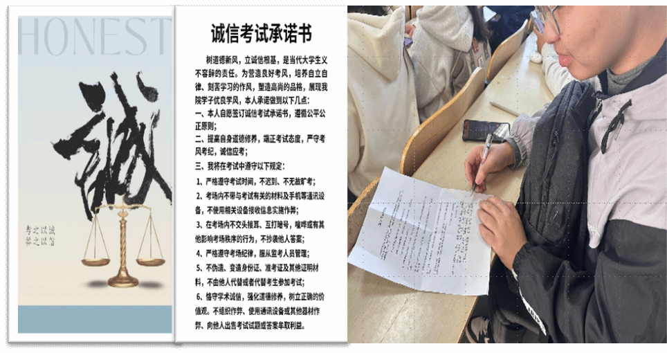学院在教学楼开展诚信考试签名活动,号召全体学生严于律己,诚信应考,自觉维护考场环境。参与活动的学生纷纷表示,将坚守诚信考试理念,营造公平公正的考试环境。