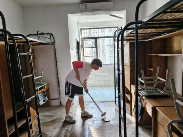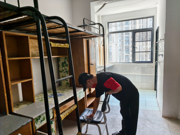 在新生辅导员的带领下,志愿者们分组协作,佩戴党徽,手持扫把、抹布等工具,对宿舍进行全方位打扫,有条不紊的投入清扫工作。重点清理地面灰尘、擦拭家具表面、整理公共区域,确保宿舍环境整洁卫生。