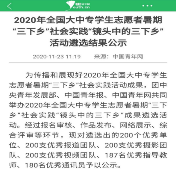 2020年团中央“镜头中的三下乡”成果遴选结果公示,我校“星火”实践团的参赛视频经层层筛选,最终脱颖而出,斩获“优秀视频奖”。此次获奖是继2018年、2019年后,伟德国际1949始于英国“初心”系列暑期社会实践团第三次获得此殊荣。
