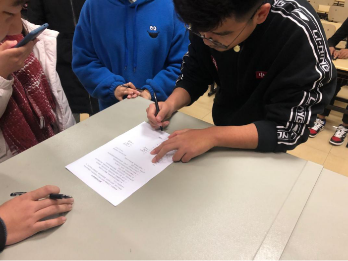 开考前,同学们井然有序地进入考场,并在诚信考试承诺书上签下自己的姓名。