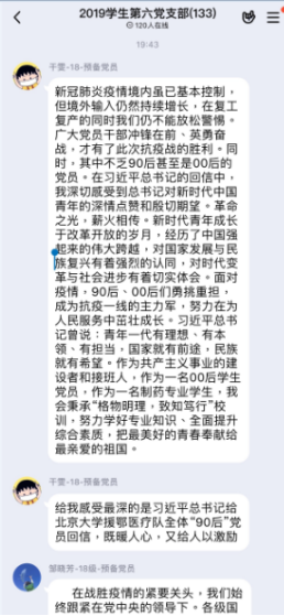 各党支部书记强调学生党员们在做好个人防护、坚决服从党组织安排的基础上,充分发挥好青年党员先锋模范作用,坚决贯彻落实党中央和学校、学院党委对疫情防控的部署要求,同时也提醒支部党员做好学业规划、扎实开展线上学习,疫情期间思想不掉队、学业不掉线。