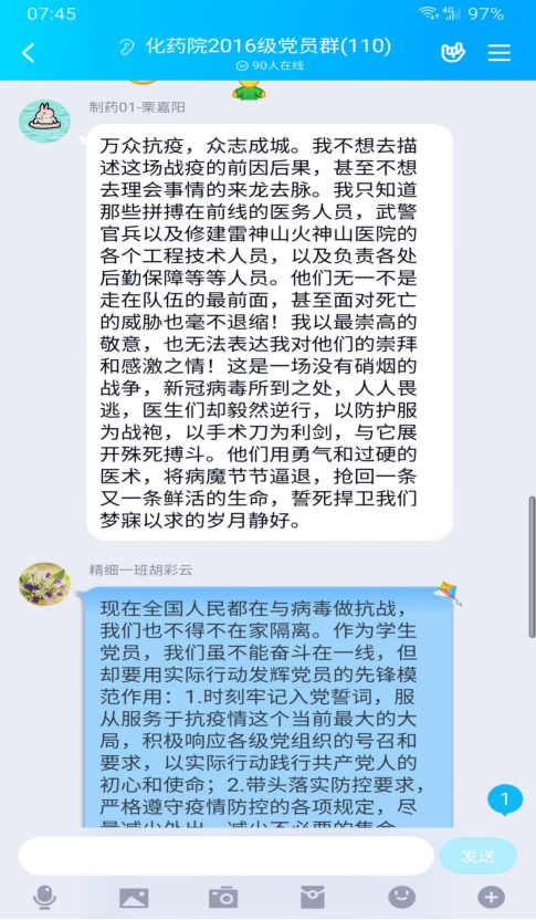 2016级在年级党员交流群开展升旗仪式,优秀党员代表学生第四党支部施显峰,学生第六党支部赵莎在观摩结束后作主题发言。全体学生党员纷纷在群里分享个人的心得体会感受。