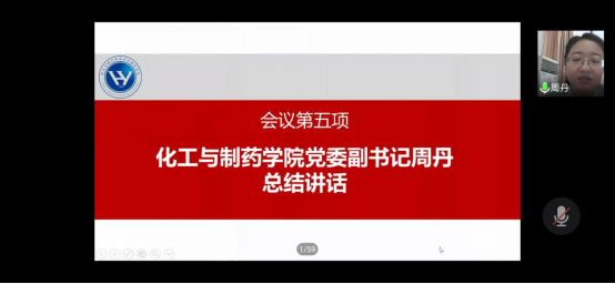 学院党委副书记周丹总结讲话。她充分肯定了学院团委和学生会一年来取得的成绩,对五位候选人的表现给予高度评价,对学院全体学生干部提出三点要求:一是要慎思明辨。行成于思毁于随,学生干部要在国家大事上求真,坚持以习近平新时代中国特色社会主义思想为指导,坚定理想信念。二是要克己自律。学生干部要增强自身的廉洁自律意识、责任担当意识,以身作则、率先垂范。同时,希望同学们抓住线上学习的大好时机,提高自律意识,努力汲取知识,不断的提升自我。三是要坚持不懈。虽然国内疫情防控形势向好,但是海外其他国家疫情防控情况依然严峻,严格服从、积极配合国家、学校的各种防控措施,是我们每个人应尽的责任和义务。越是到最后关头、越是在关键时期,越是要守的住原则、把得住底线。不信谣,不传谣,不私自提前返校,为打赢疫情防控狙击战贡献自己的力量,展现化药学生干部的责任和担当。