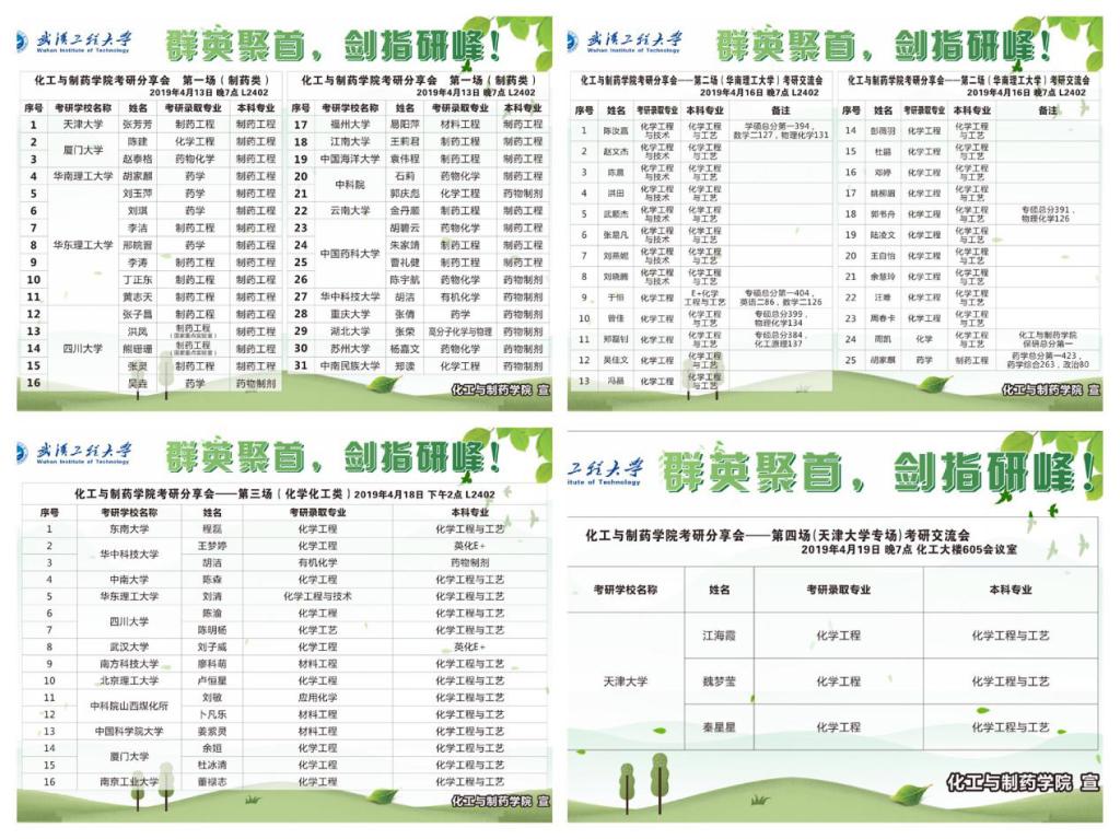 考研分享会分为化学化工类、制药制剂类以及天津大学专场、华南理工大学专场四个部分。在考研备考前期,多数同学会对考研存在一些疑问,为此,学院特邀各支部2015级优秀党员代表分享亲身经历,传授备考经验,为备考的同学们指点迷津。