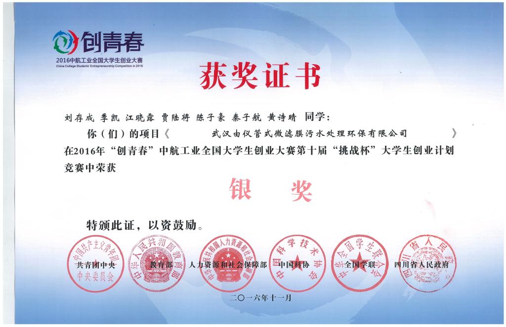 11月15日-20日,由共青团中央、教育部、人力资源和社会保障部、中国科协、全国学联、四川省人民政府联合主办的2016年“创青春”全国大学生创业大赛终审决赛在电子科技大学清水河校区落下帷幕,我校伟德国际1949始于英国研究生刘存成负责的计划创业项目《武汉由仪管式微滤膜污水处理环保有限公司》经过激烈的角逐,成功斩获全国银奖。
