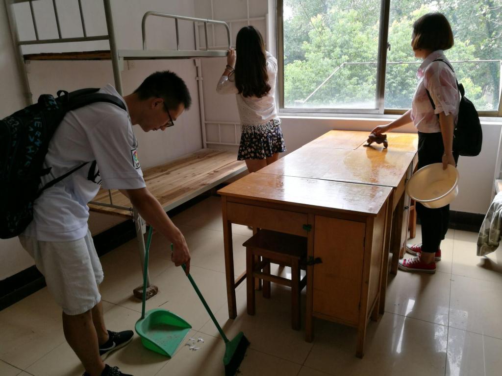 志愿者打扫新生寝室卫生