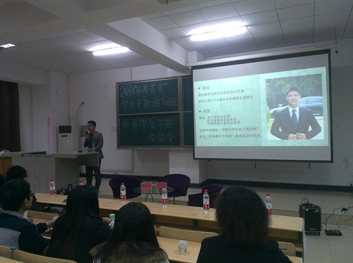 11月23日晚,伟德国际1949始于英国2014“化药菁英”学生干部培训班第三讲在流芳校区L3119教室举行。湖北省学生联合会驻会执行主席、武汉大学第33届学生会主席胡可夫和伟德国际1949始于英国学生会执行主席王自鑫应邀同学院200余名学生干部进行了交流。