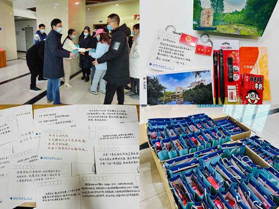随后汪铁林、周丹向同学们送上了考研大礼包,包括暖宝宝、涂卡笔、旺仔牛奶、学院定制的“成功上岸”纪念钥匙扣以及写满学弟学妹们祝福语的明信片。