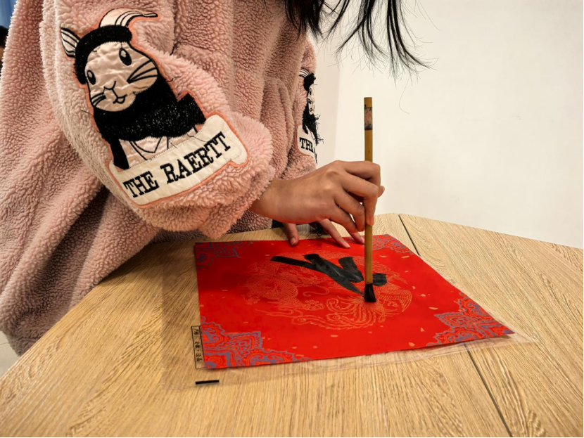 活动伊始,何雨航同学进行现场示范,讲解毛笔的握法、运笔技巧以及福字的书写要领。他笔锋婉转流畅,或苍劲有力,或飘逸灵动,一个个福字跃然纸上,赢得了在场同学们的阵阵赞叹,也激发了大家的创作热情。同学们纷纷拿起毛笔,蘸墨挥毫,全神贯注地书写着自己心中的“福”。有的同学手法娴熟,一气呵成;有的同学略显生疏,但也认真专注,一笔一划地勾勒着福字的轮廓。大家相互交流、相互学习,现场欢声笑语不断,气氛热烈融洽。从传统的正楷福字到创意十足的艺术福字,每一个作品都饱含着同学们对新年的美好憧憬和深深祝福。
