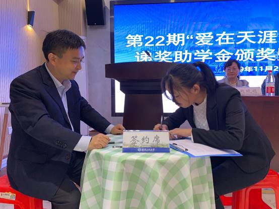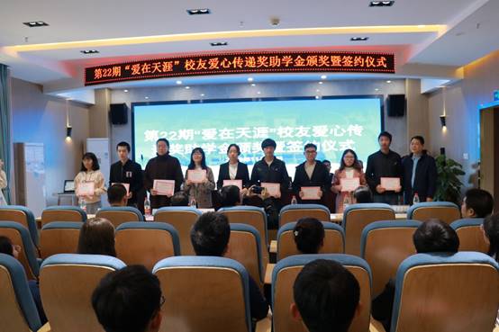 在颁奖仪式上,获奖学生与设奖校友签订了奖助协议,学生郑重承诺,要刻苦学习、提高本领、服务社会、传递青春正能量。