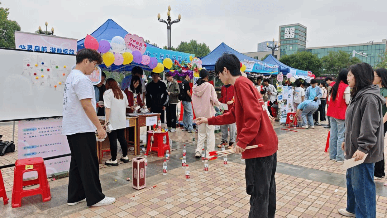 各学院及学生组织精心设置了20余个游戏项目,同学们参与游戏后即可在现场通关卡上集一个指定印章,集齐不同数量印章即可兑现便携式风扇、手机支架、钥匙扣等由心理健康教育中心定制的精美奖品。活动现场人潮涌动、气氛热烈,同学们手持通关卡穿梭于不同体验区,在多元互动中感受心灵成长,在轻松欢快的氛围中悦纳自我、释放压力。参与者既可在漆扇绘制、DIY石膏创作中浸润艺术灵感,也能通过拼图、短时记忆挑战来锻炼认知能力,“竞势投壶”、“套大鹅”、“踩气球大赛”等游戏为情绪疏导提供出口,“赶鸡入笼”、“盲盒接力赛”则以运动赋能身心,强健体魄。