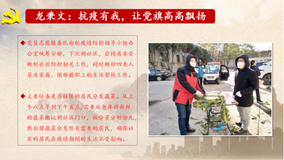 学院抗疫志愿者代表郭嘉、龙秉文、李雁博分别以“上水无言,默默耕耘”“抗疫有我,让党旗高高飘扬”“我是党员,我在家门口防控疫情”为主题,向党员教师分享了自己疫情期间为工大社区捐献物资、分发蔬菜、协助管控的故事。科研二支部书记龙秉文表示,作为党员,必须在关键时刻挺身而出,起表率作用,在疫情面前,不畏艰难,贡献自己的一份力量。虽然疫情已经得到了基本控制,但是依然不能放松要求,坚持教学、防疫两手抓,将学院疫情防控工作不折不扣地落到实处。