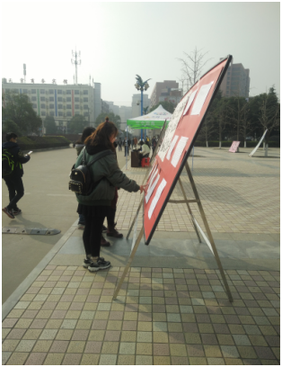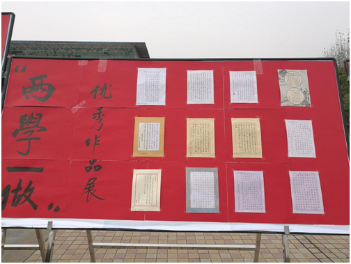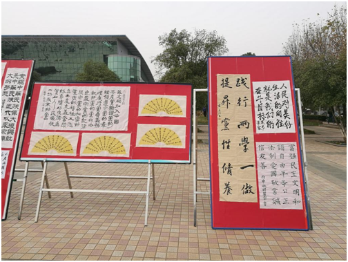 11月30日和12月1日,“两学一做”书法大赛优秀作品在流芳校区大礼堂广场前进行了为期两天的摆点展览,此次展览吸引了全校师生的众多关注。