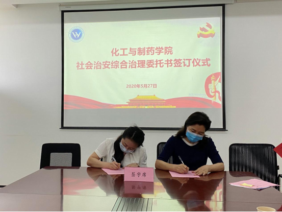 王雪梅与党委副书记周丹签订二级单位社会治安综合治理委托书。