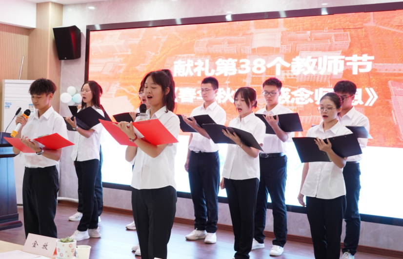 “一支粉笔,写就您人生的轨迹;两鬓染霜,谱成您人生绚丽的乐章”,学院12名新生代表声情并茂地朗诵了《春华秋实,感念师恩》,并向参会的老师献上了鲜花,献礼第38个教师节!