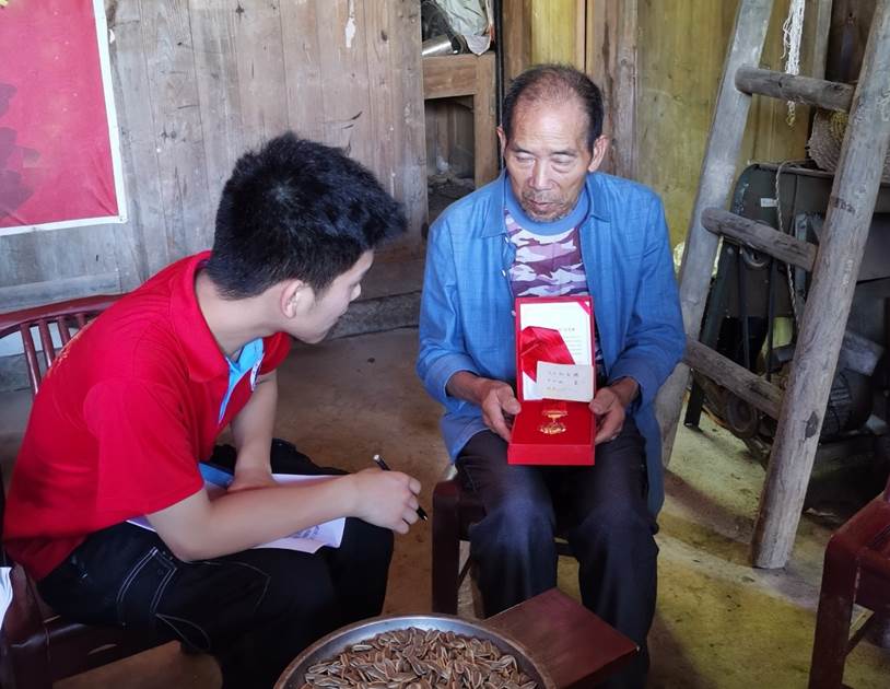 在堰塘村村委会干部的带领下,实践队员们来到第一位老党员——杨绪业爷爷的家中,杨爷爷今年94岁,入党五十余年,是“光荣在党50年"纪念章获得者。他的老伴田金云奶奶今年86岁,入党48年。杨爷爷的眼睛因为年岁已高视力较差,已经看不清景物。言谈举止之中,实践队员注意到老人眼里不时泛起泪花。那是由心而发的自豪和爱党爱国的初心。在交谈中杨爷爷鼓励大家:“你们一定要跟着党,建设我们的国家,服务我们的社会”。杨爷爷用一生践行对党的忠诚,赓续“在党”的荣光。