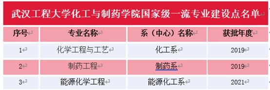 在最新发布的校友会2022中国大学一流专业中,学院位居全国“化工与制药类”专业排名第13,专业档次为A+。实现了化学工程与工艺专业、能源化学工程专业、制药工程专业均为国家级一流本科专业建设点,学院化学工程与工艺、制药工程专业通过教育部工程教育专业认证,能源化学工程获教育部工程教育专业认证受理,药物制剂专业为湖北省重点学科生物化工的支撑专业,校级品牌专业的良好局面。