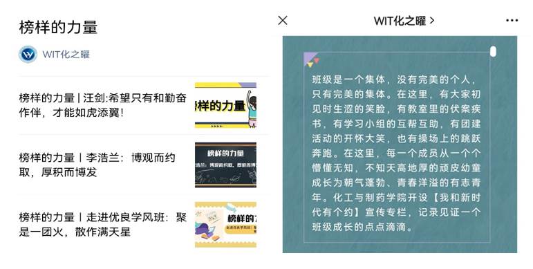 温暖如斯,成长有痕。通过学院“WIT化之曜”微信公众平台开设“榜样的力量”宣传专栏,对学院学习、就业、考研、创新等先进个人进行专题推送,记录化药学子学习成长经历,向其他同学传授学习经验,展示学院优秀学子良好的精神风貌,形成榜样力量,营造优良学习氛围,鼓舞同学们向优秀典型看齐;开设“我和新时代|班级自画像”宣传专栏,记录见证每一个班级成长的点点滴滴。