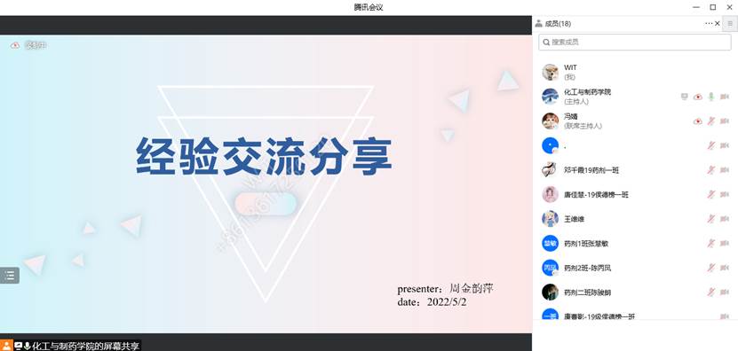 本网讯(通讯员 冯婧)为展示我院优秀学子风采,发挥身边榜样的传、帮、带作用,引导广大学子树立奋进目标,做好学业生涯规划,化药学院于5月2日举行“榜样力量 青春引航”优秀学子经验分享会,线下分享和线上观看同时进行。本次优秀学子经验分享会邀请2019级药剂学硕士研究生周金韵萍和本科2018级药卓班学生兰鑫担任主讲人,学院学生代表参加了此次活动。