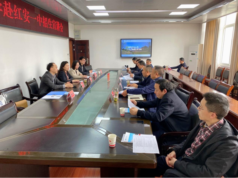 红安一中校领导对学校招生宣传队的到来表示热烈欢迎,并简要介绍了红安一中整体办学情况。徐伟伟、张盛涛分别就历年高考情况和本年度高三学情进行了分析介绍。