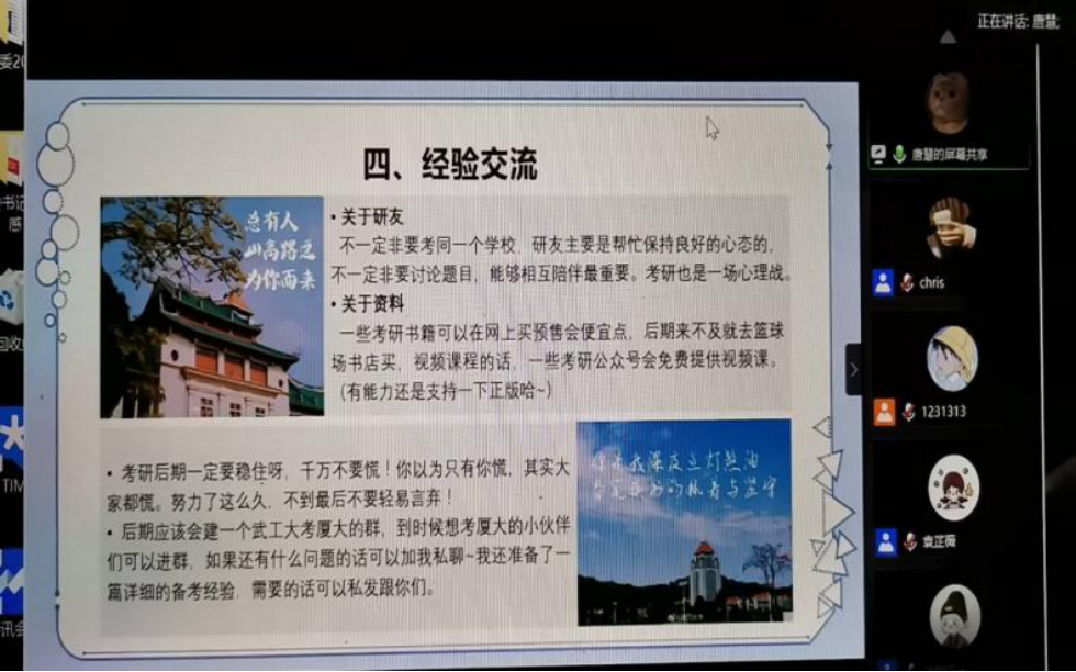 龙思会从学院专业排名、师资队伍、学科建设、培养方案等方面进行了全方位的介绍。他指出,由于疫情原因以及目前市场对高学历人才的需求,导致报考研究生人数规模逐年扩大,希望同学们对自己合理定位,正确选择报考院校和专业,同时对考研要有信心、恒心和敬畏之心,提醒同学们要稳扎稳打,不可盲目追求进度,好高骛远。要持之以恒,按照自己目标院校的要求冲刺备考,使备考的效率最大化,最后他祝愿所有参加考研的同学都能梦想成真。