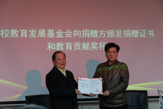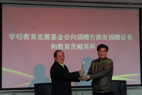 理事长叶芃代表学校教育发展基金会向董事长蔡再华颁发捐赠证书和教育贡献奖杯,并向蔡再华颁发客座教授聘书。
