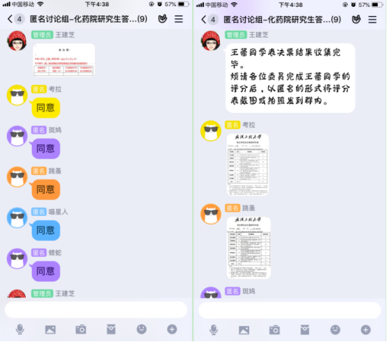 答辩投票表决及决议形成。答辩结束后,其他老师和所有同学退场,答辩委员会专家闭门讨论,并通过事先准备的匿名qq群进行匿名投票表决、匿名提交评分,并讨论确定每位答辩人的答辩决议;统计完答辩结果后答辩委员会专家再转移回答辩会场,并邀请其他老师和同学重回会场,答辩主席宣读答辩决议。