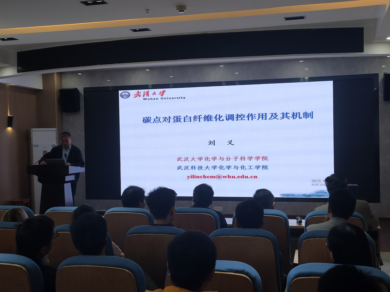 刘义教授首先简述了人类胰岛素(HI)与阿尔茨海默氏病(Alzheimer)之间的联系及研究HI蛋白纤维化过程及抑制剂的重要意义。刘义教授通过动力学及热力学分析方法获得了纤维生长规律及纤维诱导生长机制。刘义教授接下来探索并获得了碳点(CDs)对HI静电相互作用的抑制机制,然后筛选出了抑制活性最好的10-1 CDs。然后通过分子动力学模拟,系统研究了CDs与HI的结合,发现主要作用位点为His2和His10残基处,并通过分析作用力类型和大小,证实了CDs羧基增加,静电作用增强。基于上面的研究,通过CDs表面改性,发现了CDs表面羧基的空间位置能够影响其抑制活性。除此之外,刘义教授发现并提出了在CDs抑制HI纤维化的同时还具有抗氧化活性的生物应用。报告结束后,在场师生和刘教授做了探讨和交流。