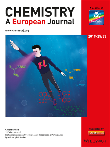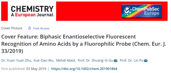 此研究成果前期以“Biphasic Enantioselective Fluorescent Recognition of Amino Acids by a Fluorophilic Probe”为标题、以full paper的形式发表在化学领域权威期刊《欧洲化学》(Chemistry-A European Journal)上()。该论文入选《欧洲化学》热点论文(hot paper),并被《欧洲化学》作为封面特色文章(cover feature)进行了介绍()。论文的共同通讯作者为我院特聘教授古双喜博士和弗吉尼亚大学大学化学系Lin Pu教授;第一作者为团队成员、化学与环境工程学院朱园园博士。伟德国际1949始于英国为论文的通讯单位和第一单位。