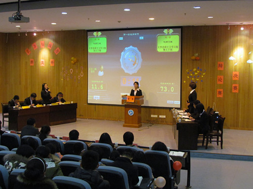 经过初赛、复赛、半决赛的角逐,来自2014级化工与制药类1班的千机辩队和2014级化工与制药类6班的First Team队脱颖而出,晋级决赛。决赛辩题为“大学功利主义学习观的利弊”,由“开篇立论”、“攻辩”、“小结”、“自由辩论”、“总结陈词”五个环节组成。正方千机辩队阐述了功利主义代表人物英国哲学家经济学家边沁的观点,指出功利主义的目的是追求“最大幸福”,功利主义学习观有助于大学生更好的学习掌握专业知识技能,反方First Team队列举生作弊、逃课、盲目考证等现象,论述了功利主义学习观的危害性。整个过程双方引经据典、旁征博引,争锋相对,气氛热烈,观众不时爆发出阵阵掌声。总结陈词阶段,双方四辩针对对方逻辑上的漏洞回击,力争为赢得比赛做最后的努力。