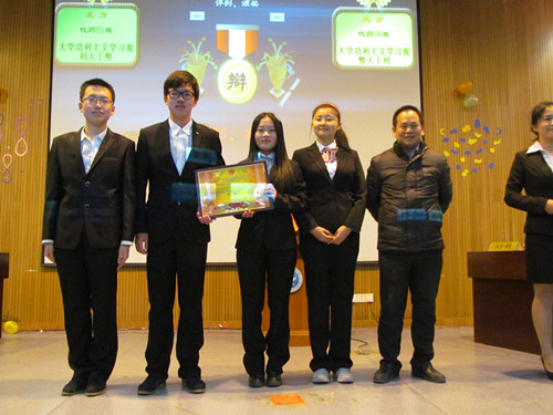 经过一个多小时的唇枪舌剑,2014级化工与制药类1班的千机辩队获胜,成为本届辩论赛冠军,2014级化工与制药类6班、2014级生物科学类5班分获亚军、季军,闵嘉欣、钟雅淇和李宏铨荣获“最佳辩手”称号。嘉宾老师为获奖辩论队和个人颁奖。