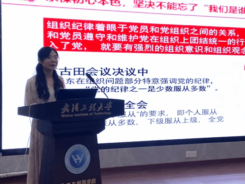 本科第四党支部书记冯婧以《筑牢思想防线,严守纪律底线》为题讲授党纪学习教育专题党课,讲解《中国共产党纪律处分条例》中“六大纪律”的基本内涵和具体要求,通过举例子、摆事实等方式,引导全体党员准确掌握纪律的边界,清白做人、公正做事,切实维护党的先进性和纯洁性。