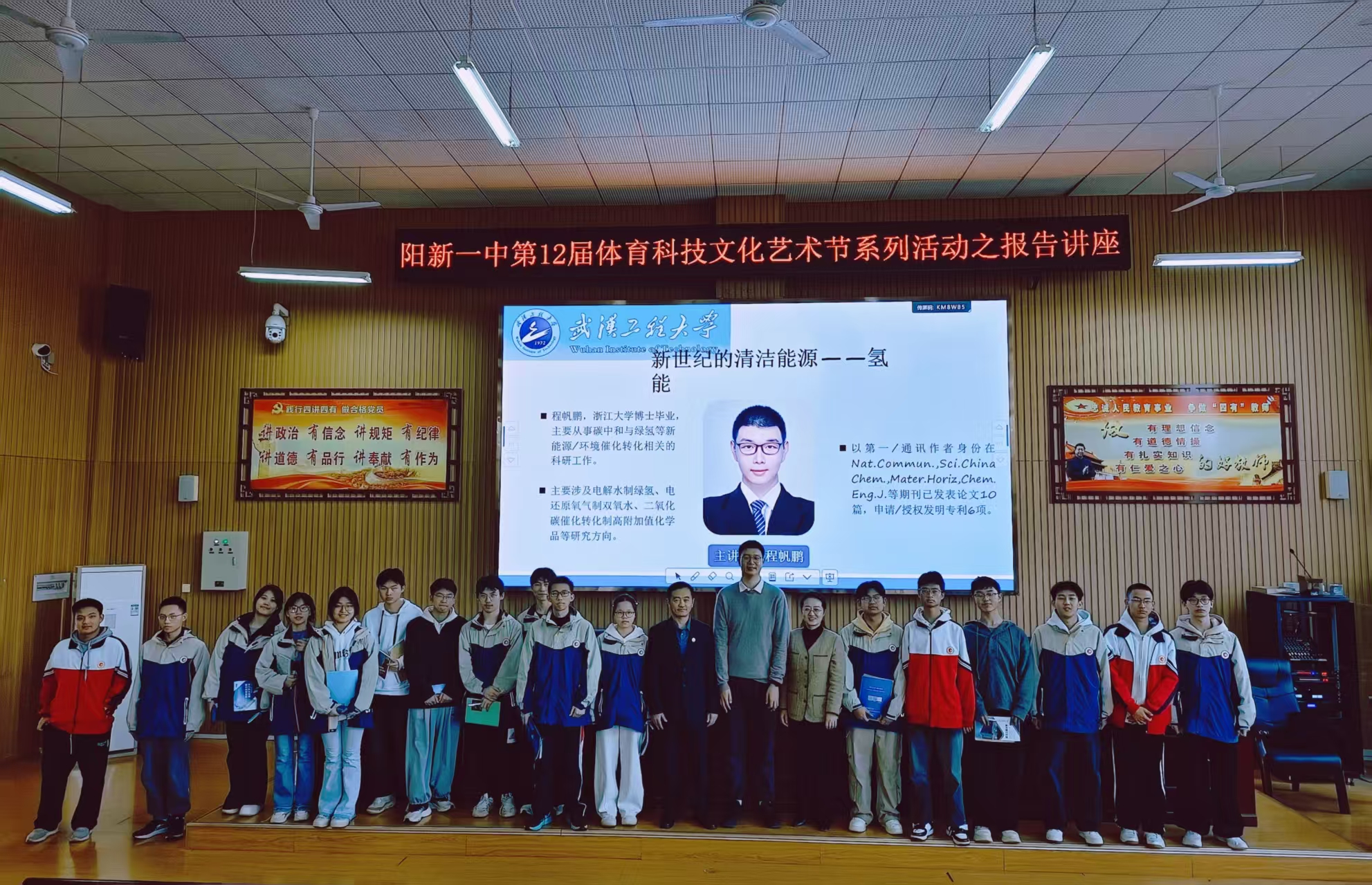 活动期间,程帆鹏以《新世纪的清洁能源—氢气》为题为阳新一中高三学子作科普讲座。他深入浅出地讲解了氢气作为清洁能源的独特优势,以及化工技术在绿色能源发展中的核心作用,引导同学们感受科学探索的魅力,激发了大家对化工专业的学习兴趣。