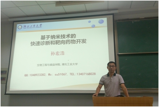 5月18日下午,湖北工业大学孙宏浩教授应邀在流芳校区四教学楼L4104教室为我校学生做了主题为“基于纳米技术的快速诊断和靶向药物开发”的学术报告。报告会由刘生鹏院长主持,伟德国际1949始于英国部分师生共计50余人聆听了报告。