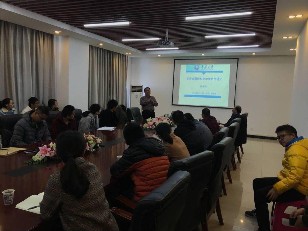 魏子栋教授紧紧围绕“非贵金属氧还原催化剂”这条主线介绍了其课题组近年来在燃料电池碳基催化剂的科研进展,并对该领域的研究重点及面临的难题作了深入细致的剖析。同时,魏教授还就自己对科研的看法和经验与在场师生进行了分享,对老师及研究生们所提出的问题和想法,进行了详细解答和分析,并与大家进行了热烈的讨论。最后,喻发全教授总结了此次报告,并对魏教授的精彩分享表示感谢。本次讲座不仅让在场的师生开阔了视野,拓展了专业思维,而且对学院的学科发展起到了积极作用。