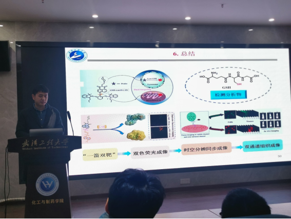 首先,徐老师由疾病相关生物标志物为出发点,针对谷胱甘肽(GSH)的生理功能以及GSH荧光探针的构建与应用引出今天的报告主题,并且从四个部分着重介绍了合成的探针分子的创新性和应用价值:第一部分介绍了应用“一箭双雕”设计策略标记两种亚细胞器线粒体与溶酶体的GSH荧光探针,有助于深入了解各种细胞器之间生理功能的相互关联;第二部分介绍了丹磺酰胺/萘酰亚胺磺酰胺类GSH探针构建及其双色荧光成像应用研究;第三部分介绍了吲哚菁绿/萘酰亚胺磺酰胺类GSH荧光探针的构建及其双通道细胞成像研究,成功实现了活细胞内同一亚细胞器(线粒体)在两个完全不同的荧光通道内的同步荧光成像,为今后发展具有高时空分辨荧光成像功能的有机荧光染料奠定了基础;第四部分介绍了该吲哚菁绿/萘酰亚胺磺酰胺类GSH荧光探针的双通道组织成像研究,有望应用于癌症相关生物标志物的早期精准诊断。