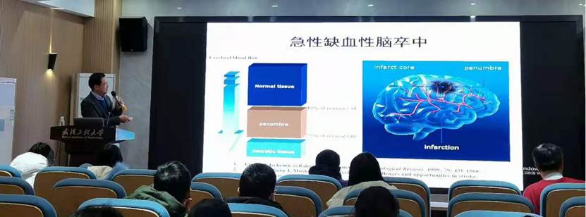 报告开始,谢敏杰教授从介绍神经系统及脑卒中引出研究方向:一,星形胶质细胞Cx43缝隙连接通道的表征及其介导脑缺血神经元损伤的机制研究。二,CYP-EETs脑缺血神经血管单元整体保护新靶点的初步探索。其内容主要有:1.星形胶质细胞间存在缝隙连接通讯偶联。2.星形胶质细胞缝隙连接通讯在脑缺血状态时能介导Ca2+等损伤信号传播。3.星形胶质细胞缝隙连接通讯介导了MCAO后海马损伤与认知功能障碍,可能是防治脑卒中后损伤与修复的重要靶点。4.证实BCAS模型选择性损伤前额叶-皮层下白质及导致认知功能障碍。5.星形胶质细胞Cx43抑制或敲除对缺血后白质起保护作用,改善了认知功能的修复。6.星形胶质细胞Cx43缝隙连接通道抑制降低了缺血后白质区Glu水平,介导了保护作用。