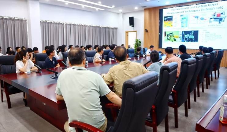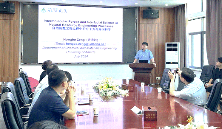 报告中,曾宏波详细介绍了矿产资源、环境工程、化工和生物化工过程中分子力与界面现象的机理,并通过生动的案例展示了这些科学原理在矿物浮选、冶金工程、尾矿综合利用、软物质材料、自修复材料、自清洁材料、油水分离、电池粘结剂、可穿戴电子器件等功能材料开发中的重要作用。他还与青年教师及同学们交流了如何分解科学问题的思路,并分享了建立可行研究方法的经验,希望大家能高效开展学术研究。在师生提问环节,曾教授耐心解答了各类学术问题,介绍了阿尔伯塔大学科研底蕴、平台和学科优势,以及前往该校访学交流的要求和途径,并邀请我校师生前往交流学习。