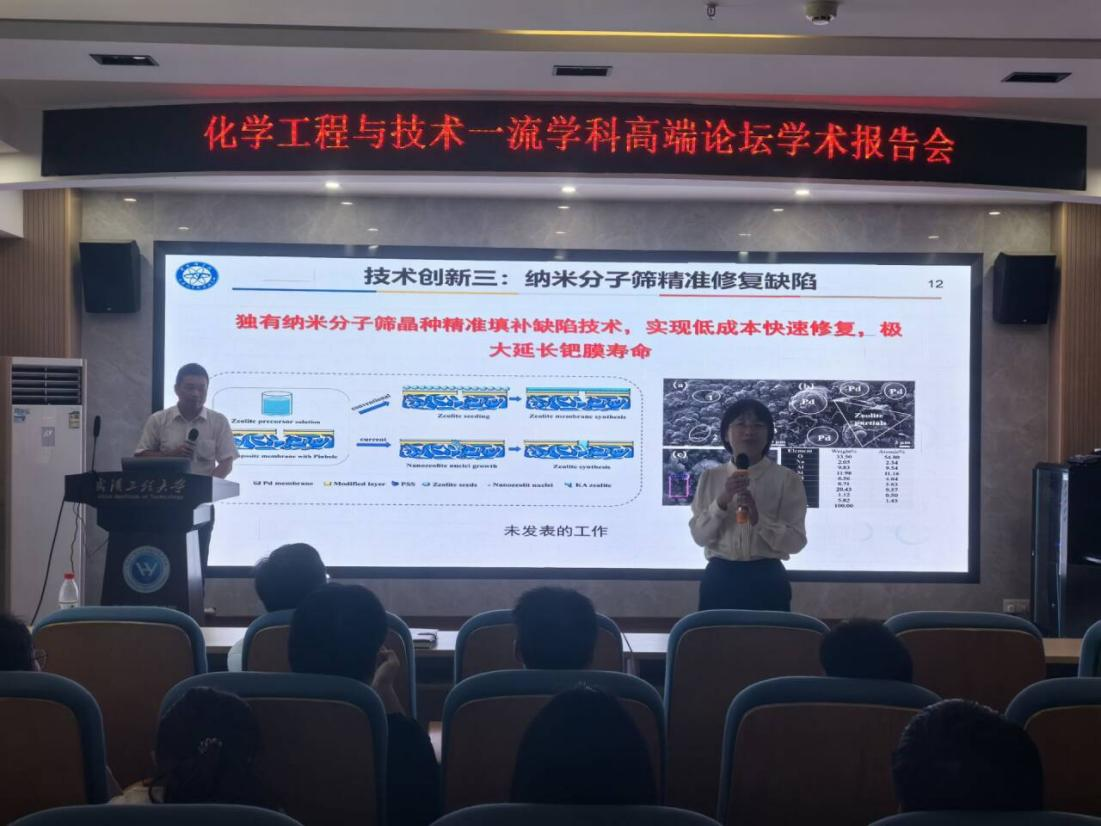 报告结束后,李慧研究员与师生围绕钯膜材料的应用性相关问题进行了讨论,就钯膜缺陷填补为何使用分子筛,分子筛是否可以在受限空间内具有良好的使用效果,以及钯膜是否可以用于氨分离等问题进行了详细深入地解答和探讨。此次报告会开阔了师生的视野,强化了师生们的使命担当意识,激发了科研热情,启发了科研思维,丰富了专业知识,让大家对化工学科的前沿研究领域有了更深入的认识和理解,对一流学科建设起到了积极的推动作用。
