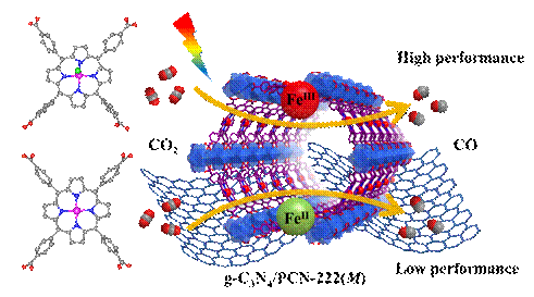 通过光催化将二氧化碳(CO2)还原成燃料或化学品,是解决当前能源问题和温室效应的有效途径之一。卟啉基金属有机骨架(MOF)一方面具有优异的捕光能力,另一方面金属卟啉可以提供良好的活性和稳定性的金属活性中心,而活性中心的还原能力与金属中心的配位环境和电子结构紧密相关。本研究制备了具有不同金属卟啉中心的g-C3N4/PCN-222复合材料并应用于光催化CO2还原,发现了不同金属中心对光催化CO2还原性能的差别。通过一系列原位表征,结合晶体场配位理论阐明了金属配位环境对催化过程的影响机制,为合理构建卟啉基MOF金属中心的配位环境以调节催化剂性能提供了重要的指导。