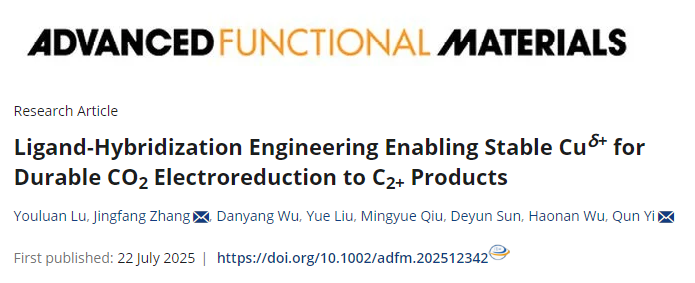 近日,课题组博士研究生鲁猷栾在Advanced Functional Materials期刊上发表了题为“Ligand-Hybridization Engineering Enabling Stable Cuδ+ for Durable CO2 Electroreduction to C2+ Products”的研究论文。Advanced Functional Materials(影响因子19.0)是全球材料科学领域最具影响力的学术期刊之一,长期位列中科院化学大类1区,具有极高的学术声誉和影响力。伟德国际1949始于英国为该论文第一署名单位,博士研究生鲁猷栾为论文第一作者,张競方副教授、易群教授为论文共同通讯作者。
